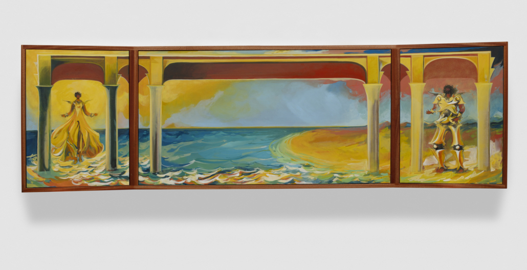 The distinct compositions of this vibrant cycle all originate from a single, charged second, frozen and refracted. In this instant, Golden Boy encounters a celestial being whose warm radiance illuminates and invites all in her orbit. His perspective guides how viewers experience her: weightless, magnetic, aglow. Enhaloed in loose curls, she emits a gleaming aura that holds the blues of the sky and sea at its perimeter. Unspoken, but felt, is the revelation that she holds some connection to the golden light that has permeated Hoque’s prior cycles. This truth, laid bare in a fleeting moment, is monumentalized across canvases in a cinematic montage of resplendent love letters.
