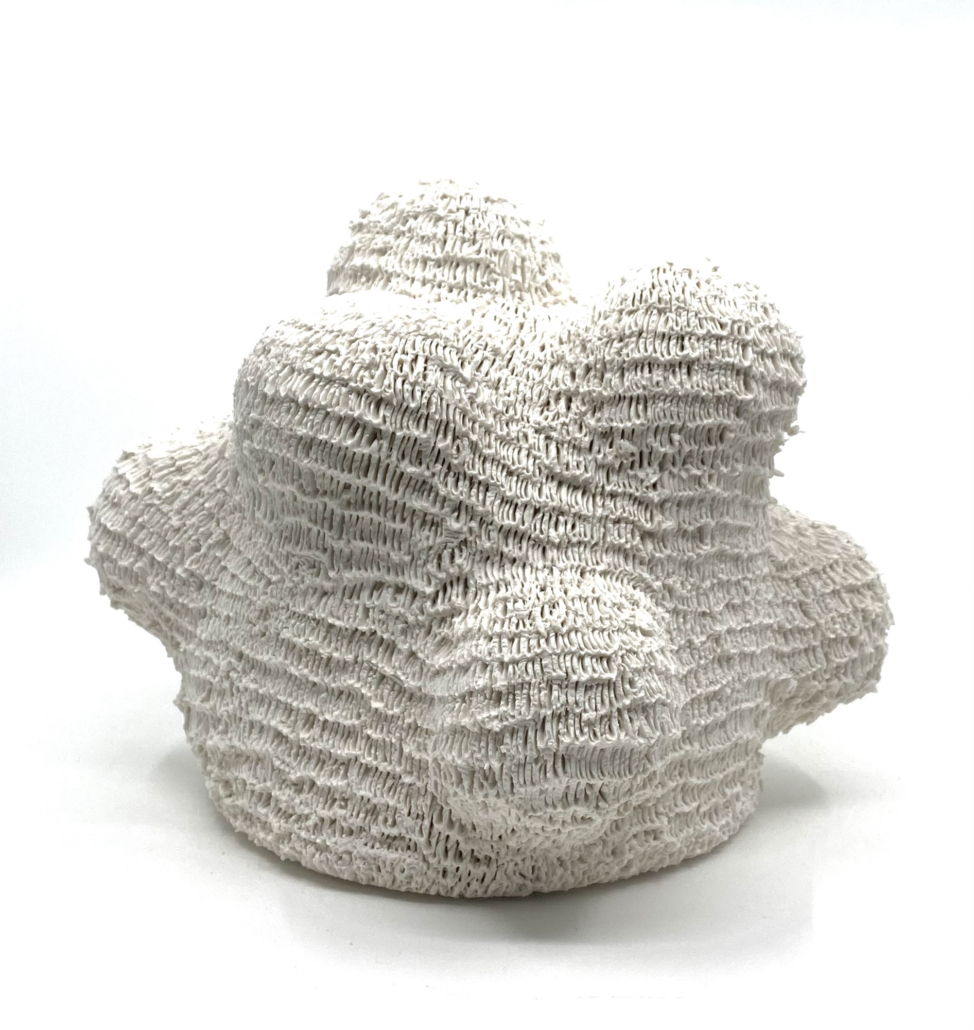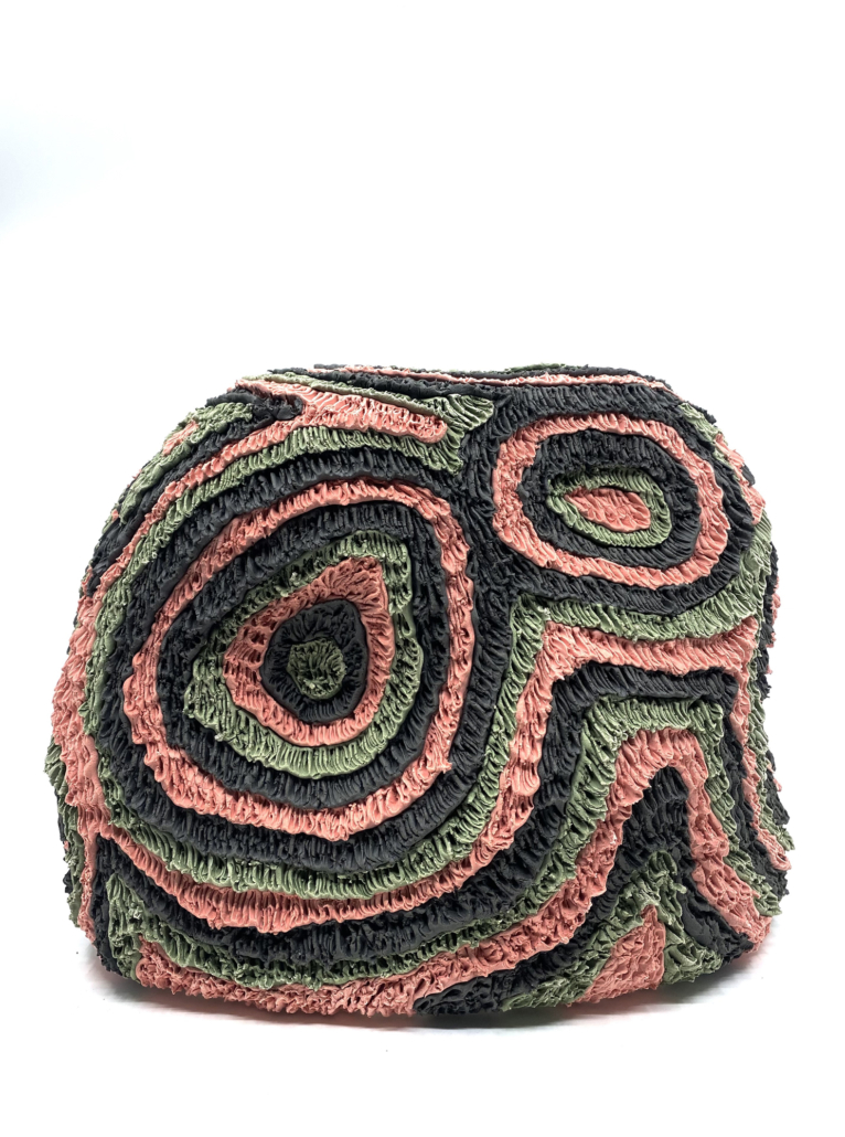 “My ceramic sculptures function as ‘future artifacts’ that remix ancestral traditions, respond to contemporary realities, and envisions resilient futures. Influenced by hip hop culture and science fiction, I use clay as both material and metaphor, building forms that I inscribe with thousands of etched lines made by a needle tool. These marks accumulate into patterns that echo hair, raffia, scars, rituals, and inscriptions. Texture becomes a conduit to archive memory, offering new understandings of how time and repetition can be recorded in material form.