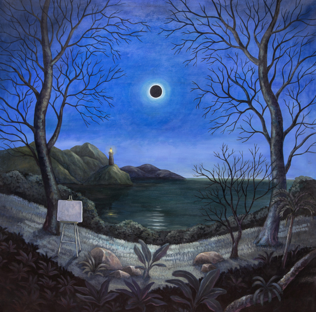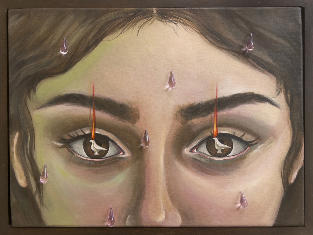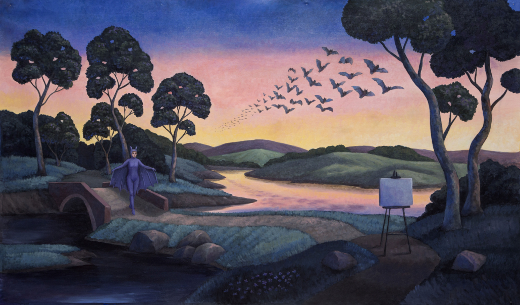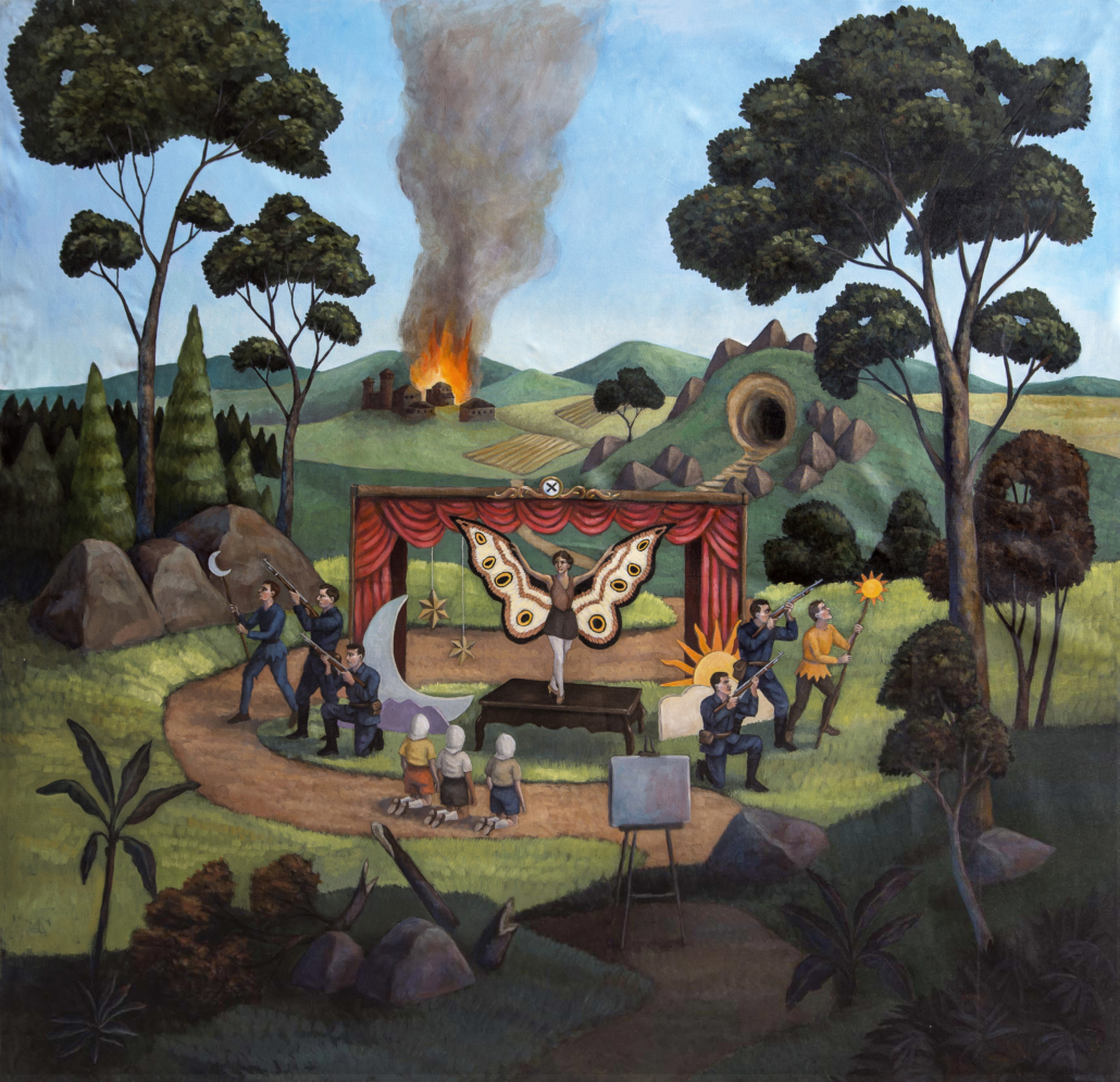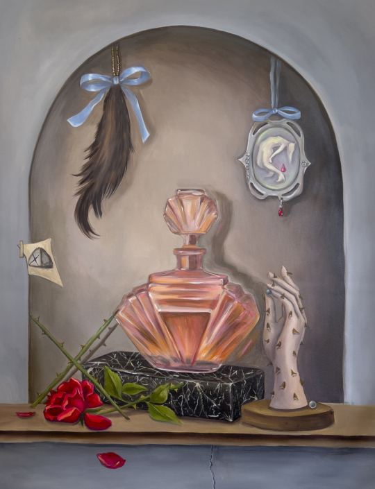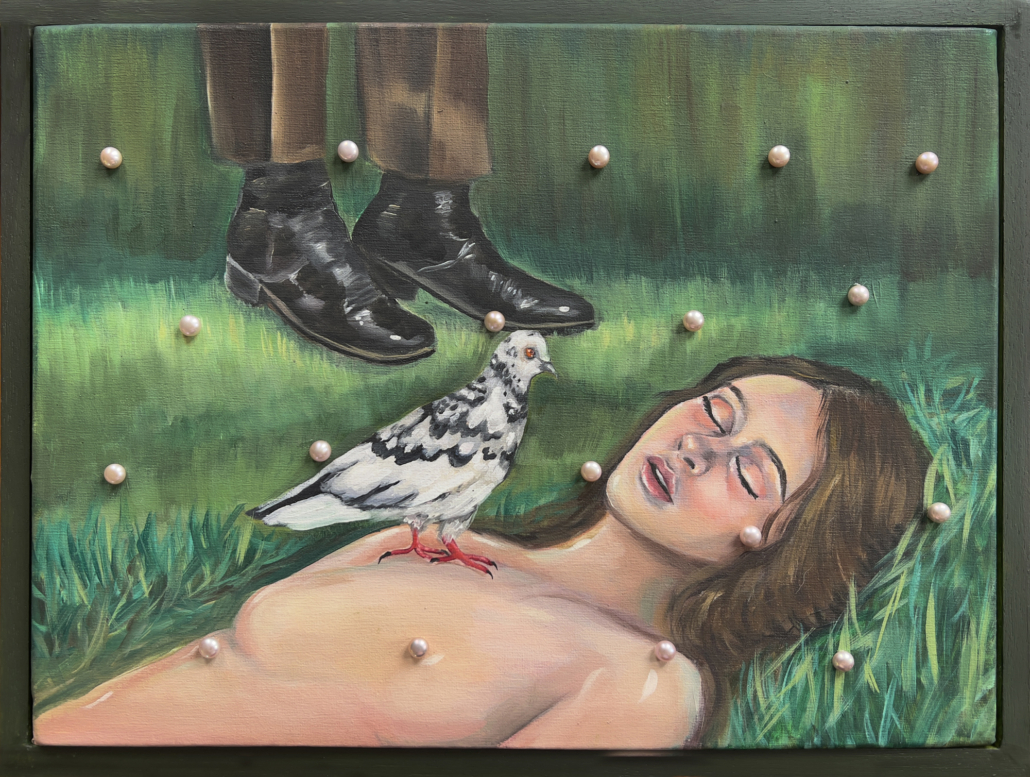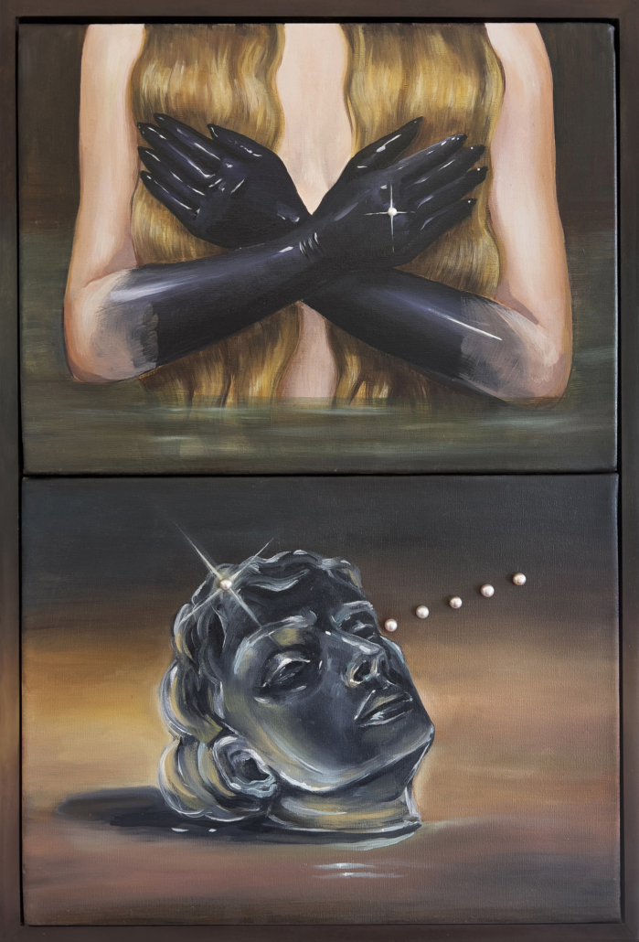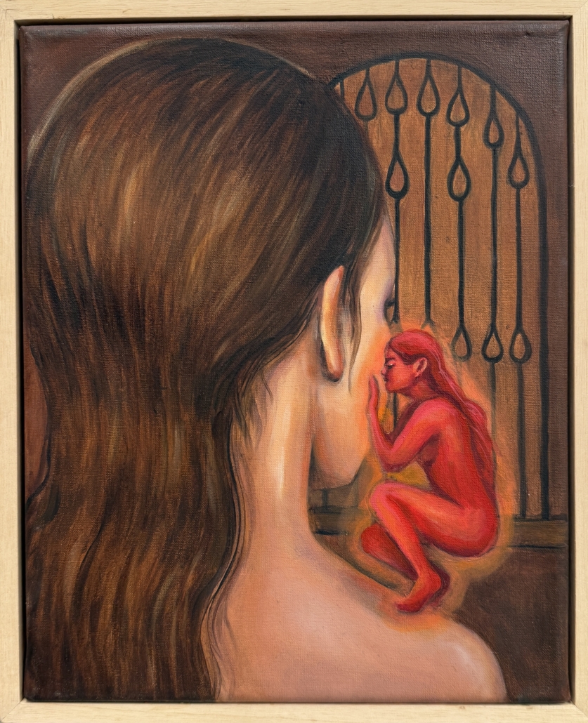 Throughout the exhibition, images extend beyond the surface of the paintings and take physical form in the space. The show unfolds as a sequence of stages, inviting viewers to move through moments of recognition and unease. Rather than pointing to a fixed meaning, X Marks the Spot guides to a place of encounter, where fiction, intimacy, and tension converge. Showcasing a myriad of works that range in size from mammoth (and two sided) to small scale, each piece is a reveal. Canevari’s works contain layers of symbolic imagery. The butterfly symbolic of transformation and change, and the tunnel a journey to the unknown. Pocetti features the female “femme fatale”, a sometimes androgynous protagonist manifesting psycho-sexual experiences in a murky theatrical-like world.