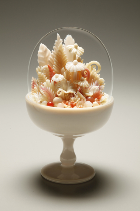 Amber Cowan’s practice centers on the rejuvenation of recycled, found, and donated American pressed glass. Working primarily with “cullet,” the discarded remnants of industrial glass production, Cowan sources material from defunct factories across the country. Through labor-intensive processes such as flame-working and glassblowing, she remelts each shard, transforming fragments of the past into intricate, luminous sculptural forms. Her works are both delicate and densely composed, evoking preservation, memory, and quiet resilience.