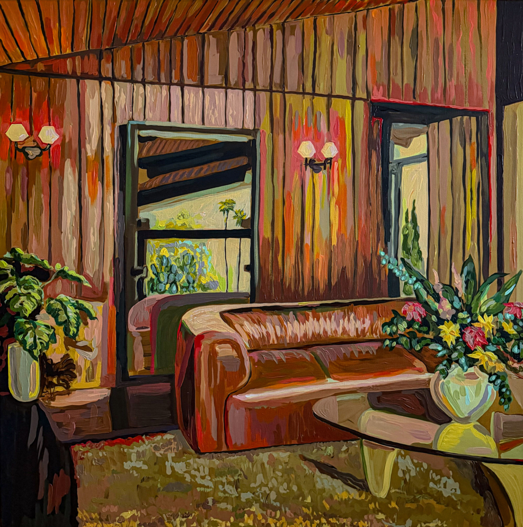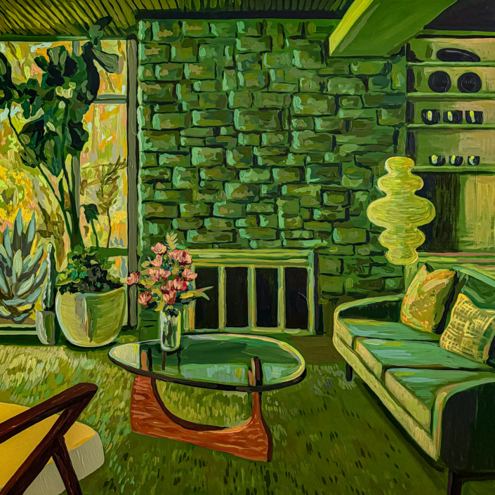 Brittany Fanning constructs dense, moody interiors alongside lush, immersive garden scenes. Drawing inspiration from domestic spaces — particularly the intimate glimpses offered by open houses — she examines how individuals curate their environments. Her gardens, similarly composed, reflect a tension between control and natural overgrowth. For Fanning, the garden becomes a site of solace and restoration, where beauty persists even in times of uncertainty.