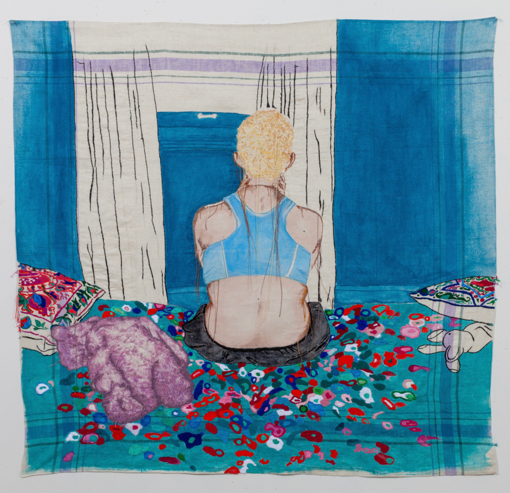 Mindy Solomon is pleased to present a visual conversation between Zoë Buckman, Amber Cowan, and Brittany Fanning at the Dallas Art Fair. Spanning a range of media — including painting, textile, and glass — each artist explores intimacy and interiority through a distinctly feminine lens.